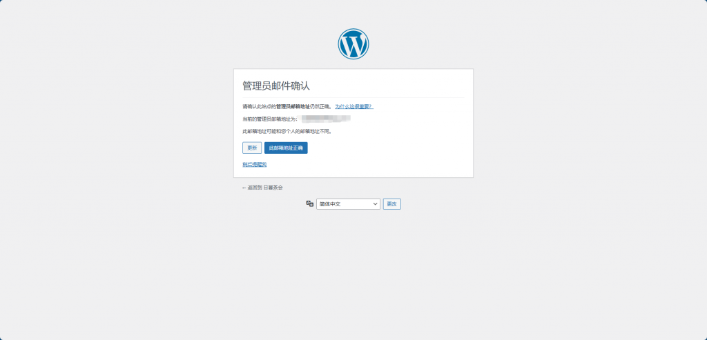 密码输入后会进行确认管理员邮箱,通过模板直接安装的WordPress的管理员邮箱默认为admin@wordpress.com,需要点击更新更换为你本人或公司网站管理员的邮箱。