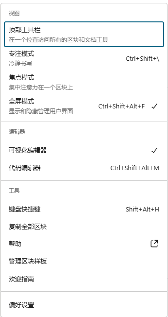 - 「三横杠」菜单:列表显示、大纲、快速访问最近使用的块、样式预设、键盘快捷键