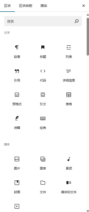 - 加号按钮:添加区块、区块样板、媒体
